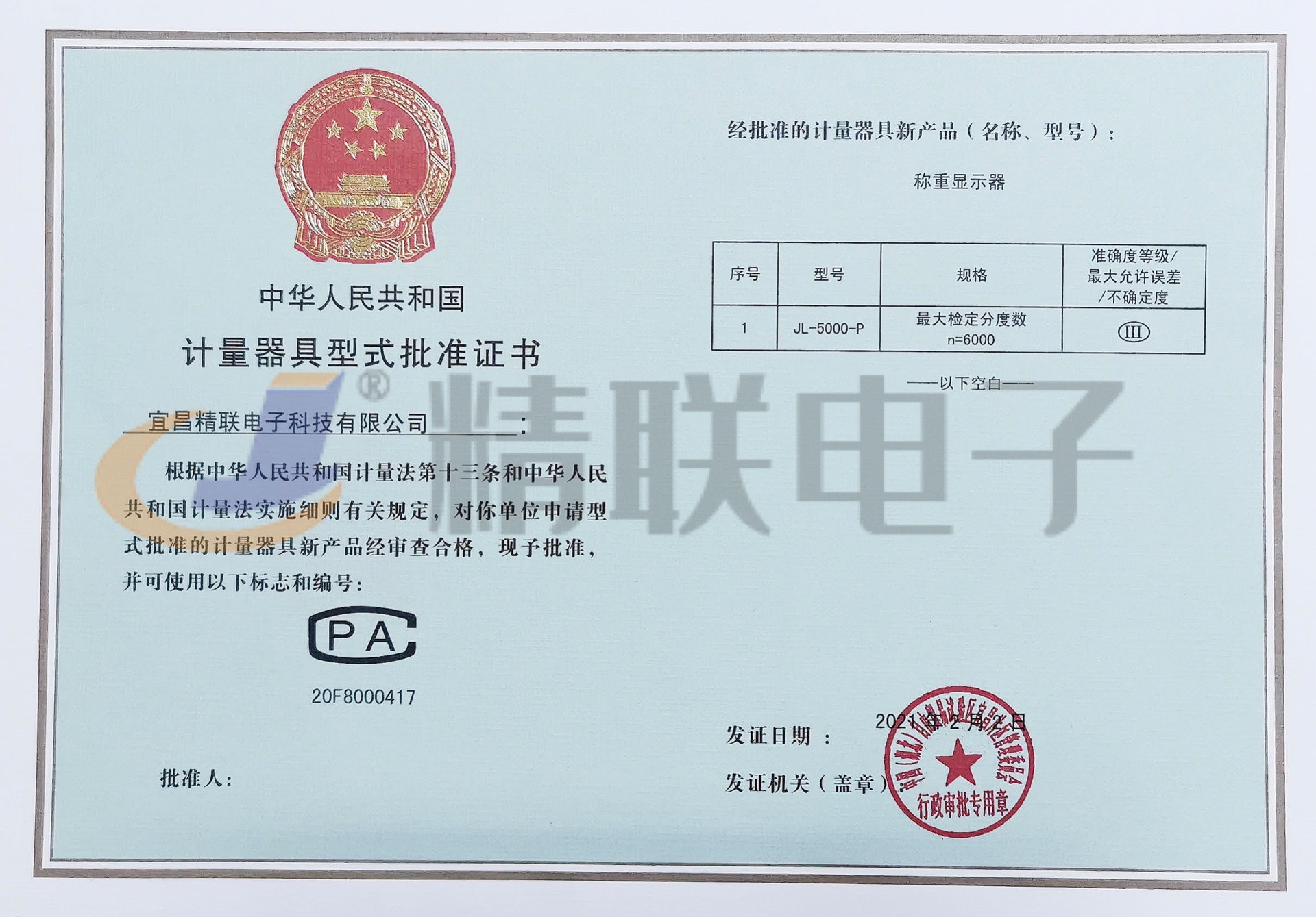 2021年,宜昌精聯(lián)電子科技有限公司JL-5000-P產(chǎn)品通過國家級科學(xué)研究院三級秤的檢驗,取得了計量器具型式批準(zhǔn)證書。通過JJF1624-2017數(shù)字稱重顯示器(稱重指示器)型式評價大綱。