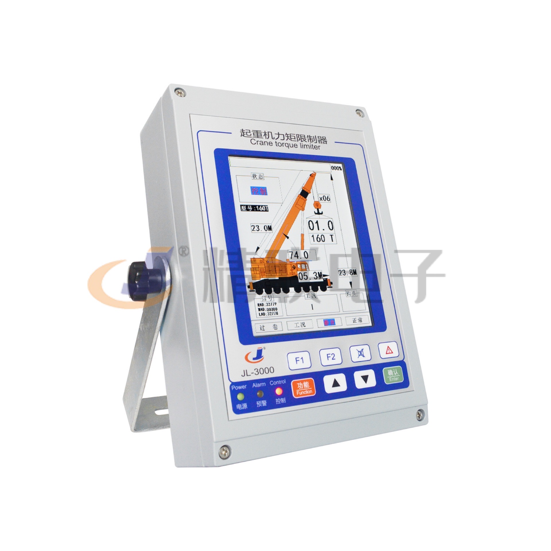 采用進口工業(yè)彩色液晶屏,分辨率高(640*480),能一屏顯示用戶關心的所有數據,如:實際起重量、額定起重量、載荷率等;或根據需要只顯示特定參數,還可數字式與圖形顯示相切換;所有操作均有文字提示,具有良好的人機對話界面;